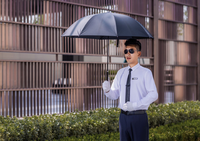 禮賓人員站姿、跨立、敬禮,每一個動作都鏗鏘有力,禮貌問詢、停車指引、遮陽服務(wù)、雨停服務(wù)等,細(xì)致周到的禮賓服務(wù)讓到來的每一位客戶都感受到賓至如歸的親切感。